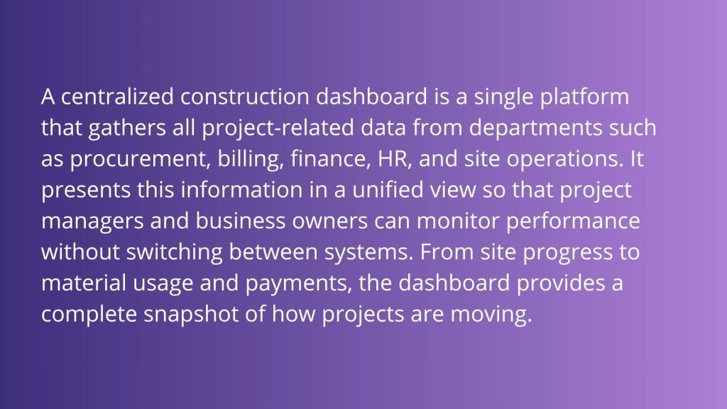 It is a single system that gathers all project information—such as progress updates, financial data, material records, and communication—into one organized platform. This helps contractors track and manage operations in real time.
