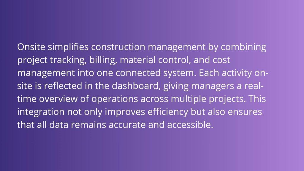 Onsite brings project tracking, billing, material management, and cost control into one platform. Managers can see live updates from sites and make informed decisions quickly.