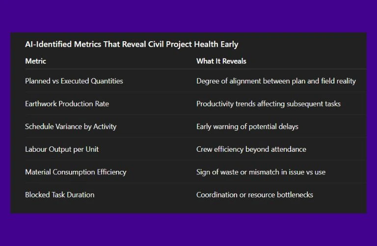 To uncover which performance signals matter most in civil project management, we asked AI to analyze common execution patterns from real project environments.