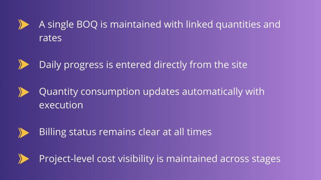 Construction BOQ software keeps BOQ data active throughout the project lifecycle. It links quantities with daily progress, billing, and material usage, helping teams track expenses accurately and maintain strong construction cost management.
