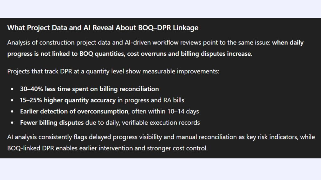 Cost control is feasible because of this connection. Variations and overruns are detected early because the DPR’s daily performed quantities are compared to the BOQ allowances. Financial shocks at the conclusion of the project are much less likely, and productivity shortages are easy to identify.