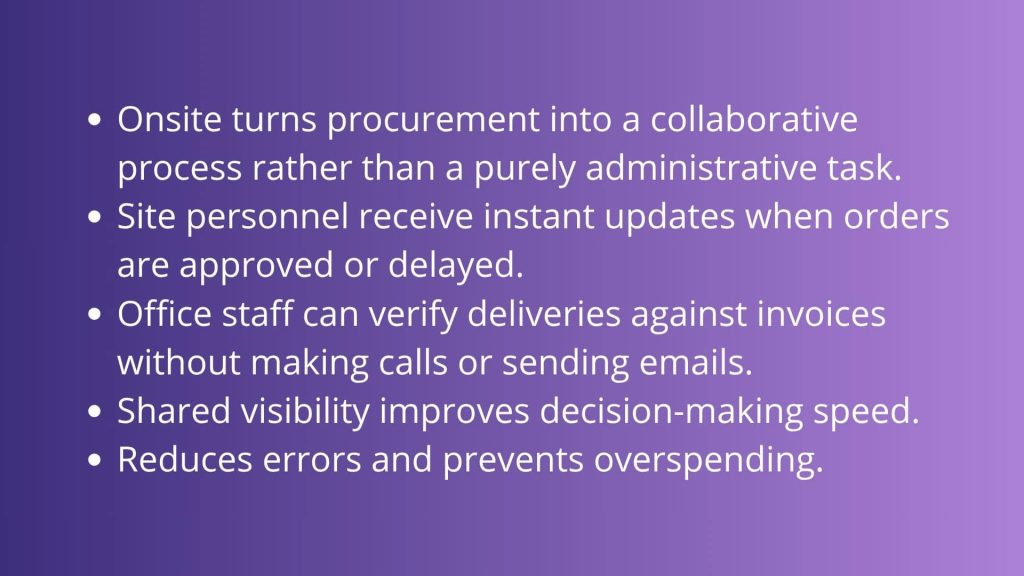 Onsite allows supervisors to request materials from mobile devices, lets office staff approve orders in real time, and tracks deliveries digitally. This ensures accurate, timely, and transparent procurement across all projects.