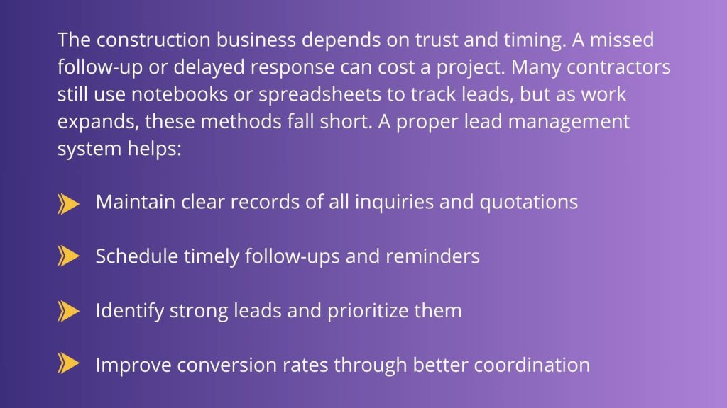 This image has a laptop with CRM Management. This image contains the following meta text: Lead Management Software for Construction Companies