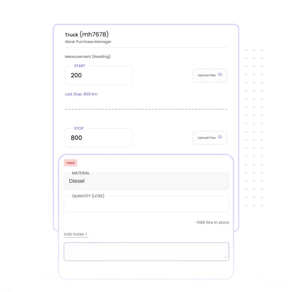 Maintain detailed usage records for every piece of equipment by tracking operating hours and usage entries at site level. These logs help teams understand actual utilization, identify underused assets, and plan maintenance activities based on real usage instead of assumptions.