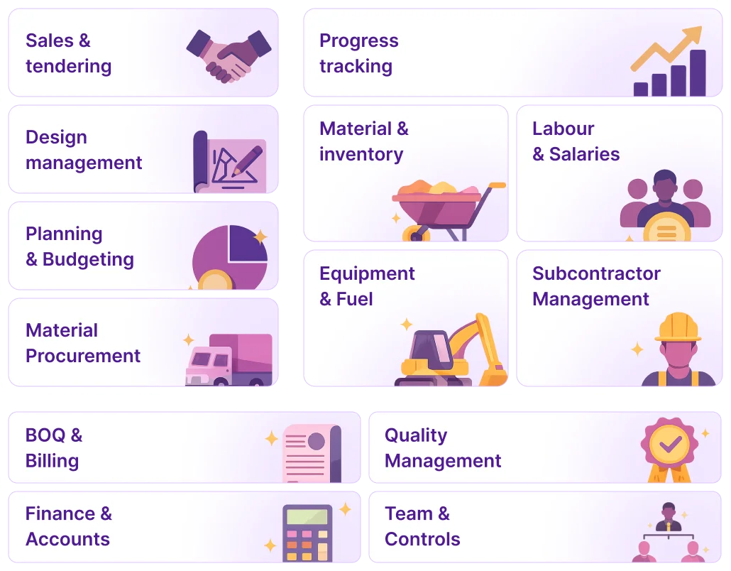 Construction companies using disconnected tools for materials, labour, finances, and site tracking cannot maintain real-time control. Data lives in silos. Reconciliation happens too late. Cost overruns surface only after margins have eroded.