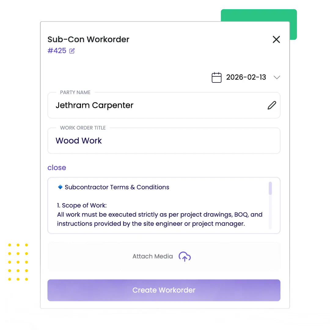 Create scope-based work orders linked to agreed quantities, rates, and project budgets. Define work scope, BOQ items, and payment terms before execution begins. Prevent scope creep and verbal commitments that cause billing disputes later. For teams working with multiple crews, a subcontractor management software lets you keep every job visible and on schedule. This helps you keep a transparent record of the work.