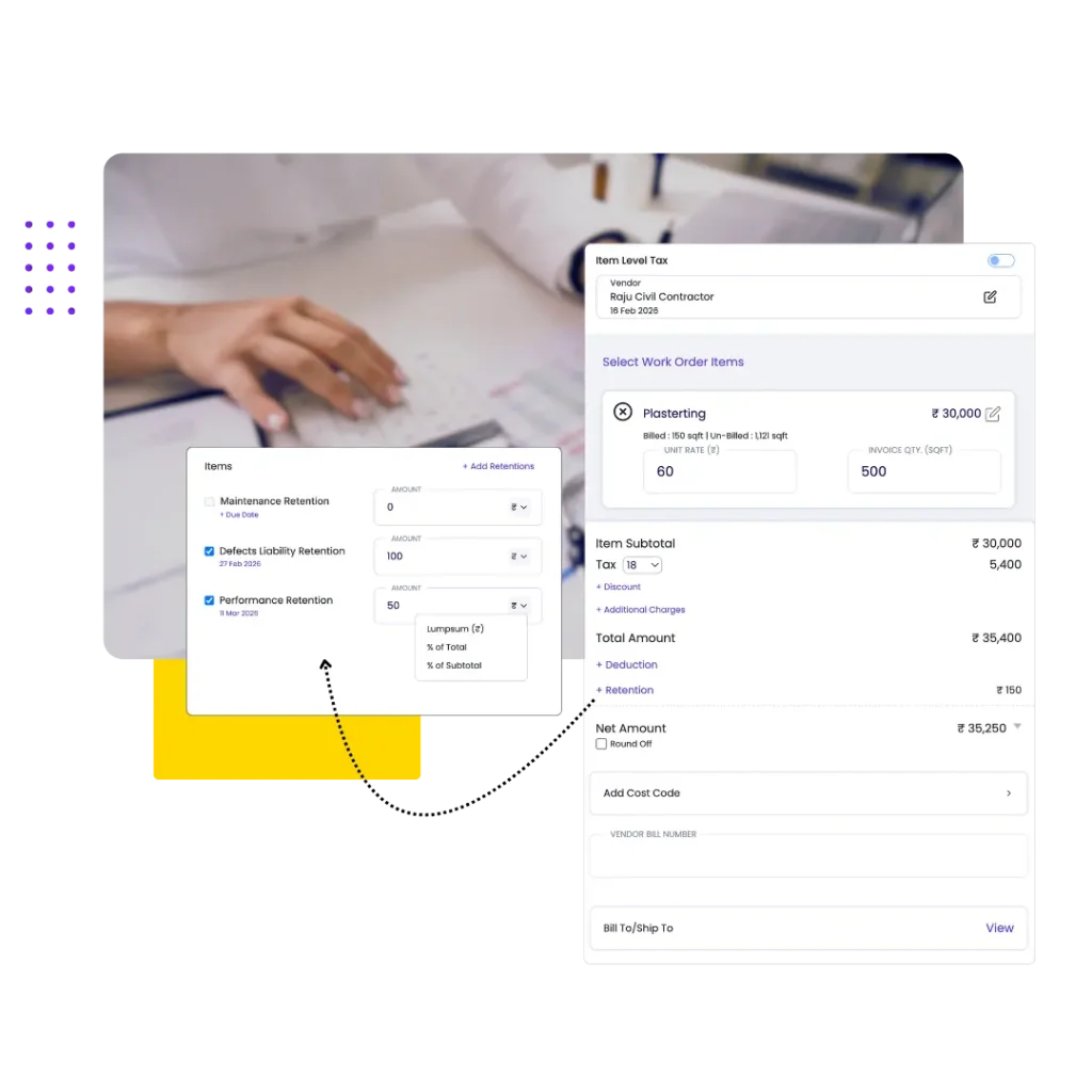 Control material bill verification, subcontractor bill validation, equipment hire billing, payment tracking, and approval workflows across every active project and every vendor relationship from one connected platform.