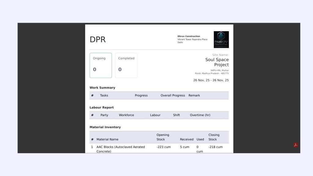 Onsite offers task-wise DPRs with photos, voice notes, and time stamps—all stored digitally. You can generate clear, formatted reports in seconds.