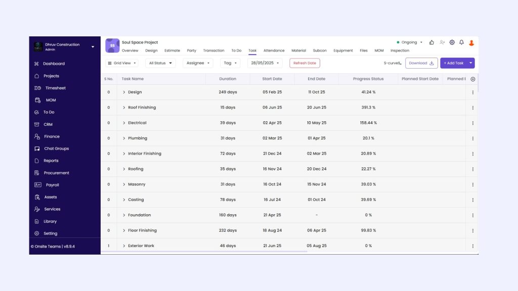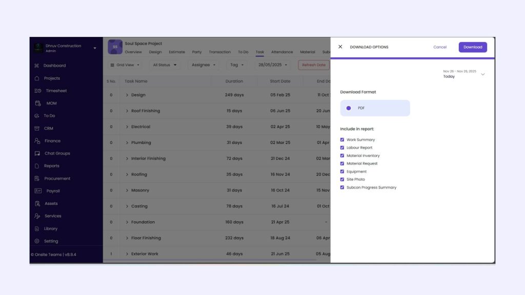 Easily track progress across all your projects in one place with Onsite. Simply open a specific task and generate its DPR with a single click. You can also create an overall Constrcution DPR for quick sharing. Plus, filter progress data by date or task status to get exactly what you need, fast and hassle-free.